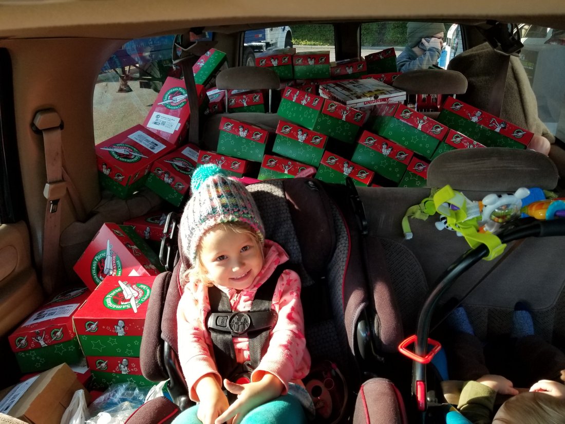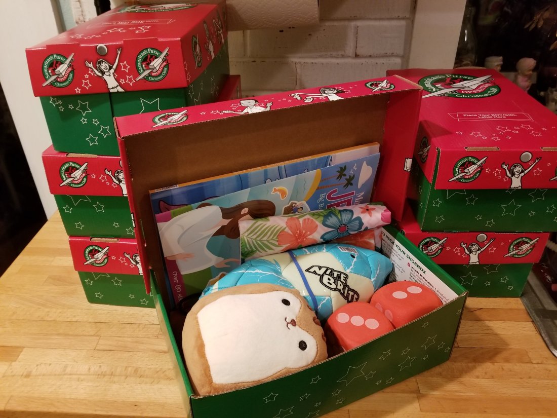 Next, we had to give back to our community somehow. For us, we brainstormed ideas and none of them seemed like enough. So, instead we decided to involve our community in the gift giving process through Samaritan’s Purse International Relief for Operation Christmas Child. We assembled shoe boxes to be filled with Christmas gifts for children around the world and spread the word of God in the process.. β€