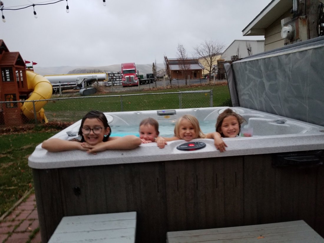 Our girls had a super fun time together in the hot tub while it was cold and raining..
