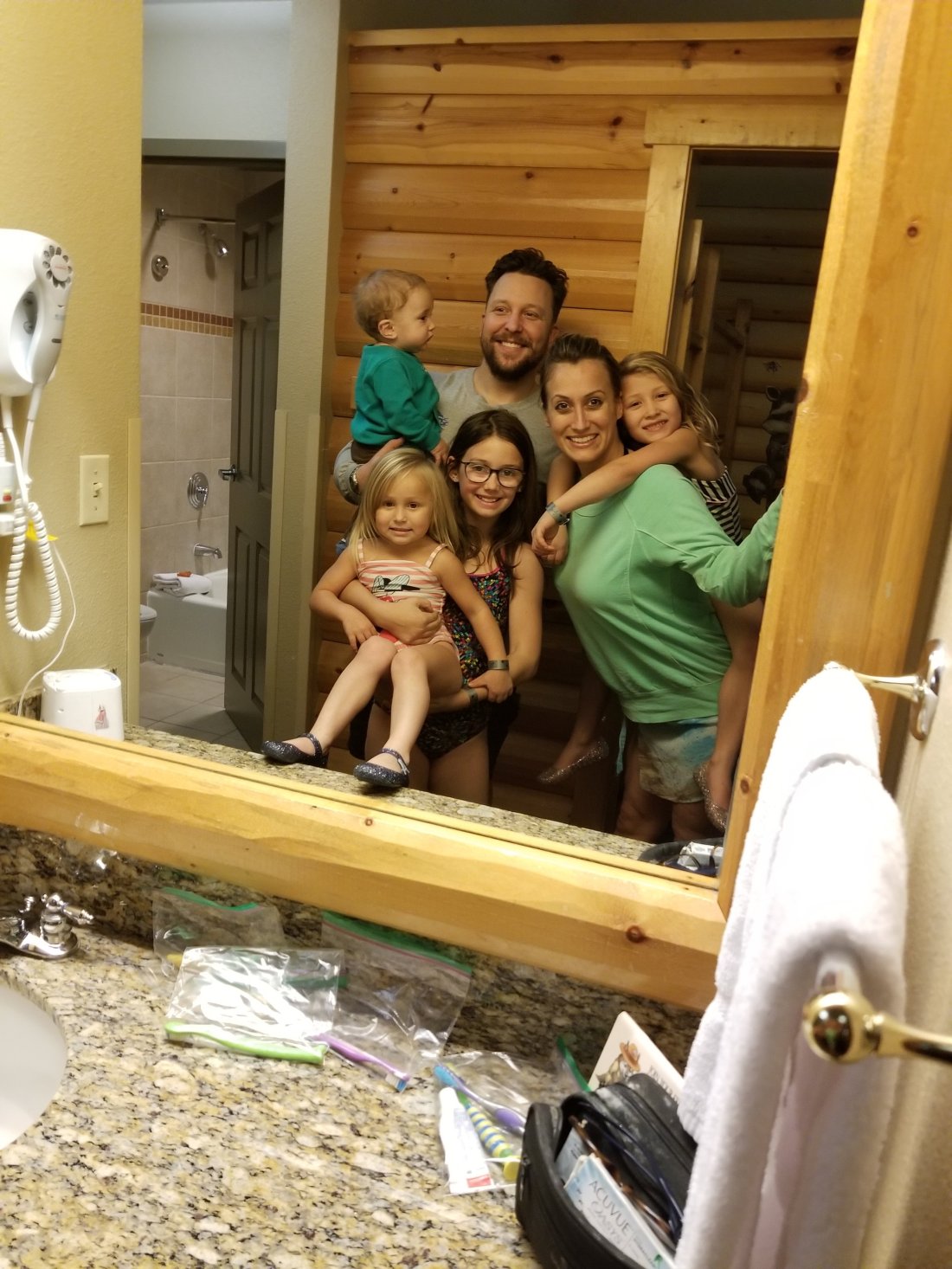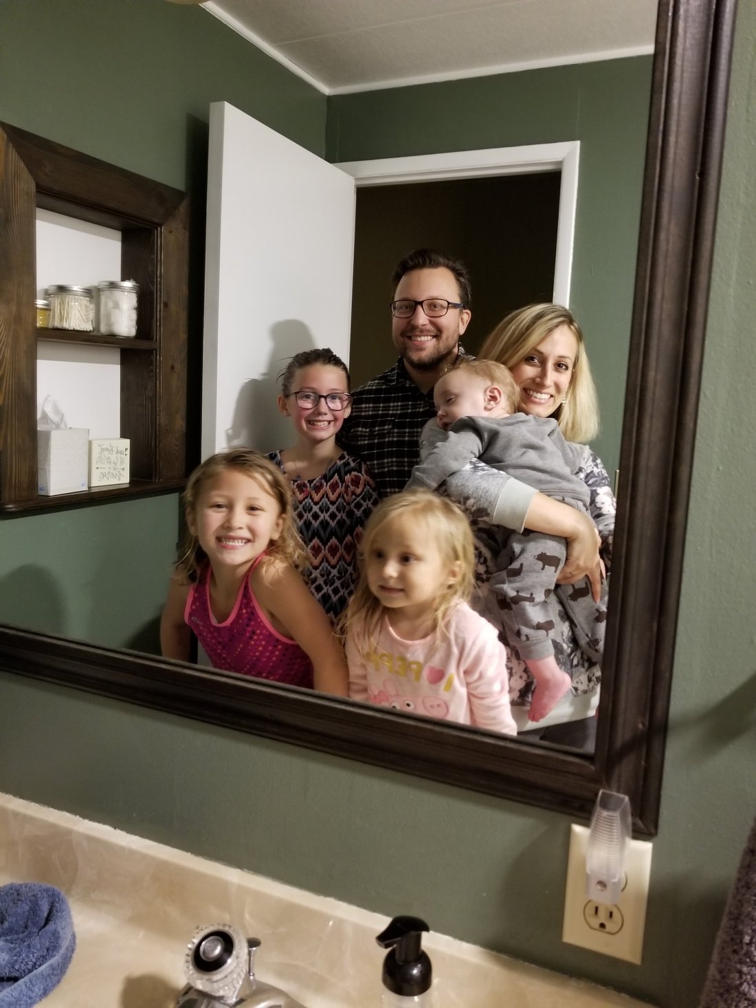Even if it is a mirror picture taken by me with red-faced, messy haired and sleeping babes… the important thing is that I remembered to get a picture of us before the day had passed. π