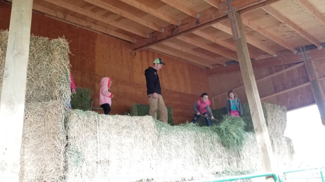 The girls even got to pitch in with some chores the next morning! βΊ Feeding the cows involved climbing into a huge loft and throwing it down to the herd below. They loved it!