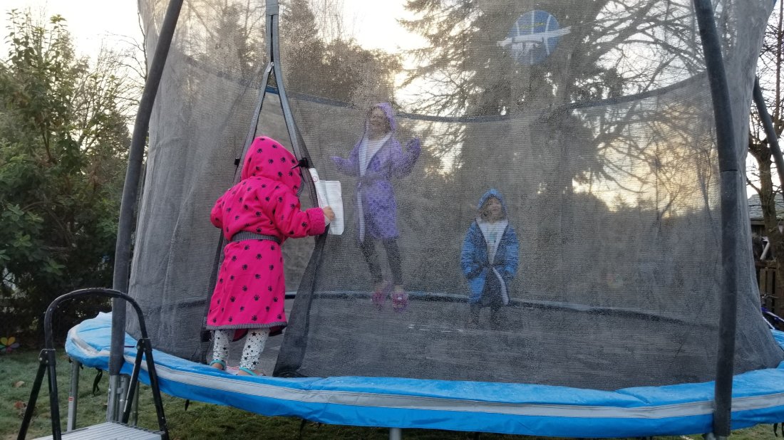 The little ones have enjoyed trampoline time while big sisters are at school.