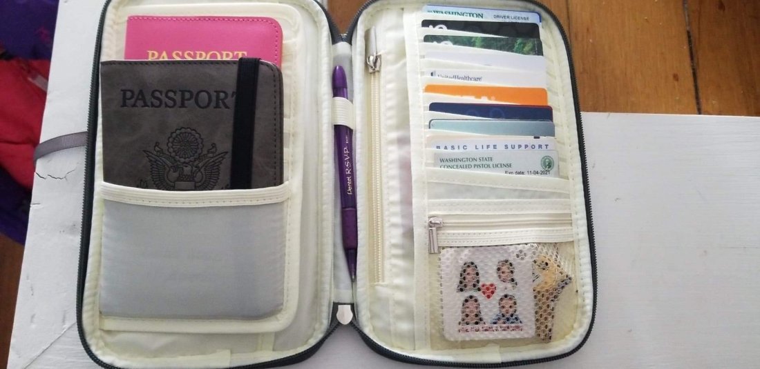 Our train passes* (*add to list if traveling around any European country) fit easily, along with a pen holder, a small netted zipped pocket, a large zipped pocket, an area to keep your money, and lots of slots for any credit, debit, and ID cards.